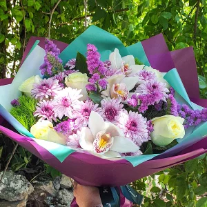 Летняя свежесть - букет из орхидей, хризантем и роз