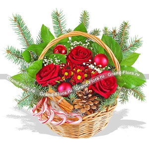 Фейерверк - корзина из роз, хризантема и новогоднего декора