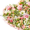 Стандартный: роза розовая - 4 шт., роза розовая кустовая - 4 шт., эустома белая - 3 шт., альстромерия - 3 шт., гипсофила - 2 шт., гвоздика кустовая розовая - 3 шт., декоративная зелень, фетр желтый, оазис.