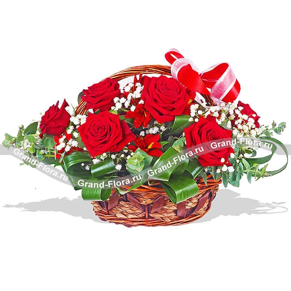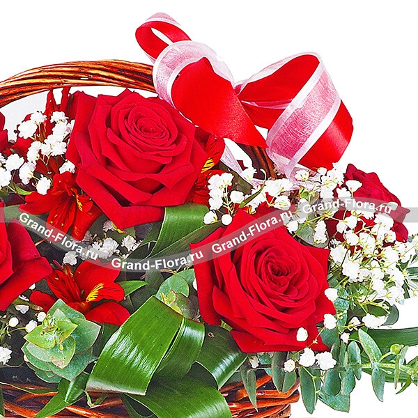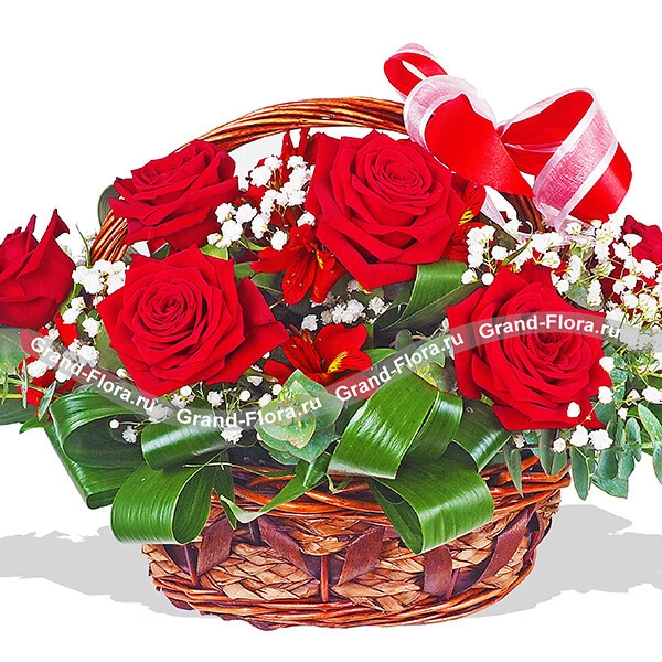 Стандартный: роза красная - 5 шт., альстромерия красная - 2 шт., гипсофила - 3 шт., декоративная зелень, оазис, корзина малая, бант красный.