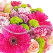 Уменьшенный: гербера малиновая - 3 шт., роза розовая - 1 шт., хризантема розовая - 2 шт., хризантема зеленая (сантини) - 2 шт., альстромерия - 1 шт., фетр розовый, бант розовый.