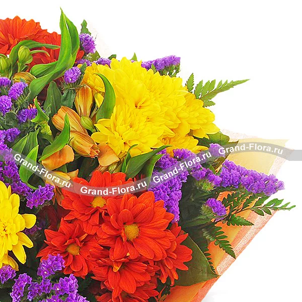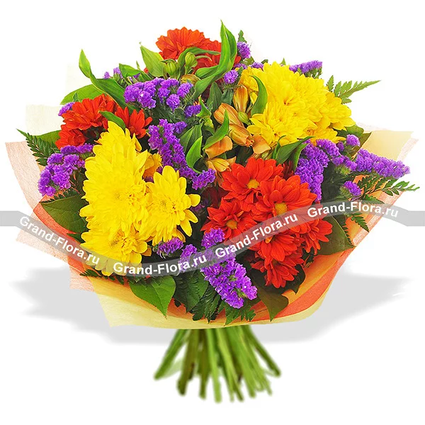 Стандартный: хризантема желтая кустовая - 2 шт., хризантема кустовая оранжевая - 2 шт., альстромерия оранжевая - 2 шт., статица - 4 шт., фетр желто - оранжевый.