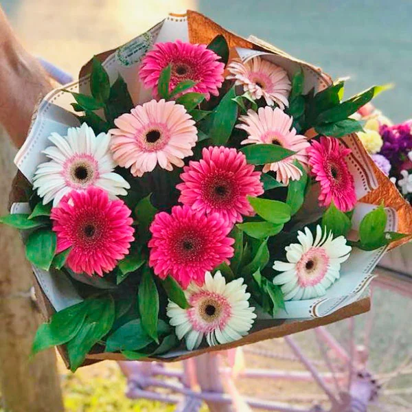 Стандартный: гербера малиновая - 6 шт., гербера розовая - 5 шт., декоративная зелень, упаковка крафт, лента.