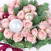 Стандартный(на фото): роза кустовая розовая - 7 шт., новогодние игрушки - 8 шт., ель, оазис, коробка.