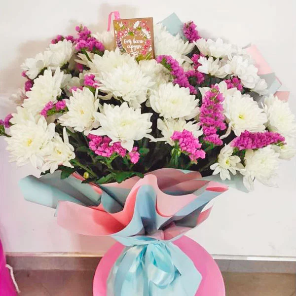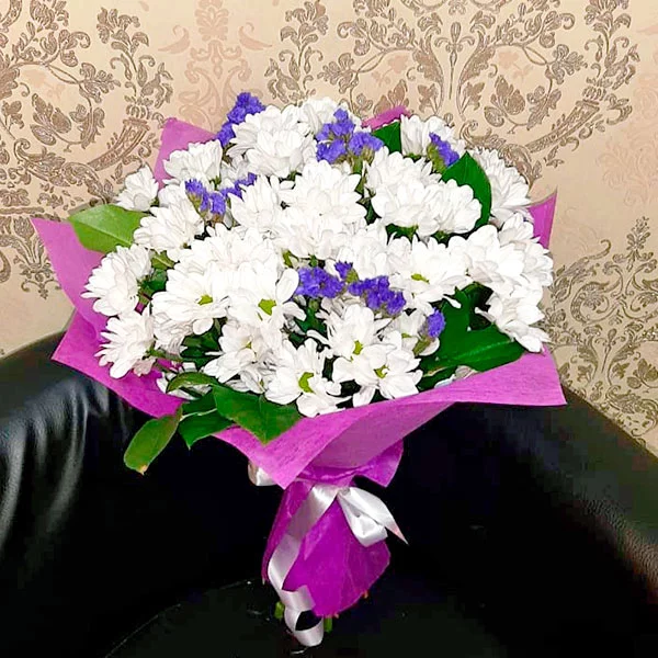 Букет из элегантных белых кустовых хризантем – само олицетворение нежности и женственности. Такой изысканный комплимент даст девушке почувствовать себя прекрасной богиней!